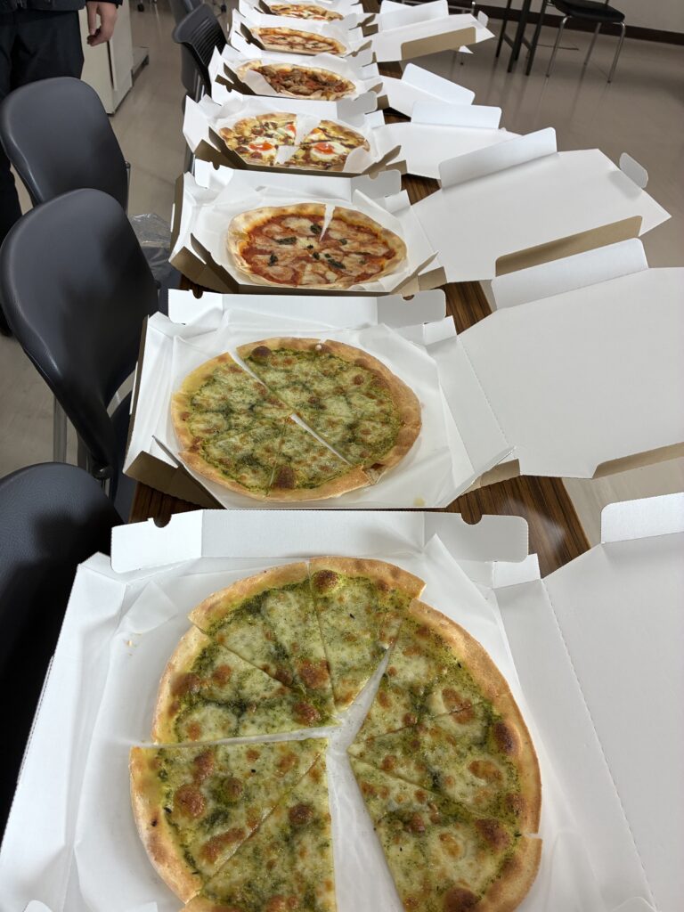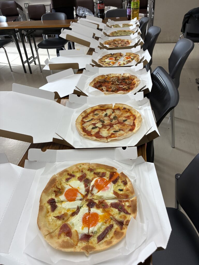 2年生の学生実験の合間を縫って,試薬リストを東京化成の TRMS へ移行するための約 4,000 本におよぶ試薬整理を行いました。大変な作業でしたが,皆さんの協力のおかげで無事に完了しました。お疲れ様会として,石窯料理 Tramonto さんのピザでランチ会を開き,労をねぎらいました。本当にお疲れ様でした。