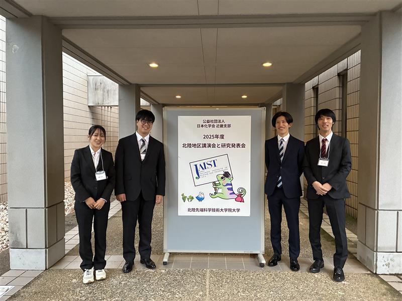 2025年11月21日(金)に北陸先端科学技術大学院大学で開催された2025年度北陸地区講演会と研究発表会にD1北井,M2明石,前川,岩本が参加し,ポスター発表を行いました。M2にとっては最後の学会発表となり,これまでの成果の集大成となりました。その頃,添田は一人,福井県の仁愛女子校で出張講義を行っていました。